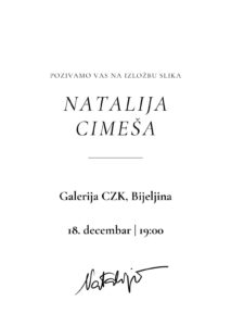 U Galeriji Centra za kulturu, 18. decembra 2025. godine, u 19:00 časova biće otvorena izložba slika akademske slikarke Natalije Cimeše.