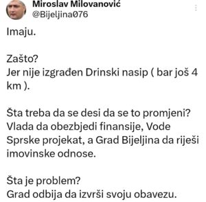 Problem koji koči završetak izgradnje nasipa uz Drinu leži upravo u neriješenim imovinsko-pravnim odnosima. Da bi se nastavili radovi, potrebno je riješiti vlasništvo nad zemljištem na kojem se nasip gradi. Međutim, Grad Bijeljina još uvijek nije završio ovaj proces, što dovodi do kašnjenja i povećava rizik od novih poplava.