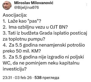 Objava člana Predsjedništva SNSD-a Miroslava Milovanovića na društvenoj mreži X izazvala je pažnju javnosti u Bijeljini. U formi „asocijacija“, kratko, gotovo telegrafski, Milovanović je iznio niz tvrdnji i pitanja koja se, po svemu sudeći, odnose na gradonačelnika Bijeljine Ljubišu Petrovića.