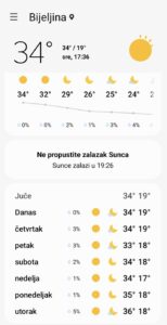 Sudeći po aplikaciji na mobilnom telefonu nemamo se čemu dobrom nadati. I narednih šest dana temperatura u najtoplijem dijelu dana neće padati ispod 33 stepena Celzijusa.