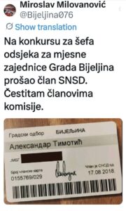 BIJELJINA – Objavu člana Predsjedništva SNSD-a Miroslava Milovanovića na mreži „X“, u kojoj je „pohvalio“ komisiju što je za šefa Odsjeka za mjesne zajednice imenovala člana SNSD-a Aleksandra Timotića, dio javnosti tumači kao otvoreni sarkazam i političku poruku, a ne kao iskrenu čestitku.
