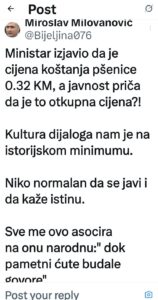 Milovanović u svojoj objavi naglašava da je kultura dijaloga u društvu došla na istorijski minimum i da niko relevantan ne istupa javno da objasni pravu istinu. Takođe, poziva sve nadležne da izađu sa preciznim informacijama i razjasne razliku između cijene koštanja, koja predstavlja sve troškove koje poljoprivrednik ima tokom proizvodnje i otkupne cijene, koju plaćaju mlinari ili otkupljivači i koja bi trebalo da obezbijedi i prihvatljivu zaradu proizvođačima.