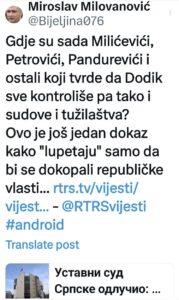 Jedan od rijetkih koji se dosljedno oglasio povodom ove situacije je član predsjedništva SNSD-a Miroslav Milovanović. Njegova objava na mreži X, u kojoj se pita “gdje su sada Miličevići, Petrovići, Pandurevići i ostali koji tvrde da Dodik sve kontroliše pa tako i sudove i tužilaštva?”, sada dobija dodatnu težinu. I zaista, odluka Ustavnog suda da sruši normu koju je predložila sama Vlada Republike Srpske pokazuje da institucije još uvijek funkcionišu u okviru svojih nadležnosti, odnosno da nisu puki instrumenti političke volje.
