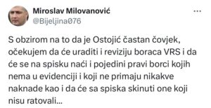 Milovanović je u objavi na društvenoj mreži X naveo da, s obzirom na to da je Ostojić, kako je istakao, „častan čovjek“, očekuje da će biti urađena revizija boračkih spiskova, te da će se na evidenciji naći i pojedini pravi borci koji do sada nisu ostvarivali nikakva prava niti primali naknade.