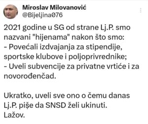 Milovanović ne razumije Petrovićev rezon koji smatra da sve što je SNSD Bijeljina svojevremeno uradio, sada želi ukinuti. S obzirom da ga na kraju posta naziva „lažovom“ očigledno da ukidanja brojnih prinadležnosti za studente, sportske klubove, poljoprivrednike, privatne vrtiće i novorođenčad neće biti.