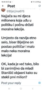 „Najjača su mi djeca milionera koja uđu u politiku i počnu držati moralne lekcije“, piše Milovanović i dodaje, umjesto da razvija „biser Bijeljine“ kako je okarakterisao Etno selo, Stanišić je izabrao politiku.