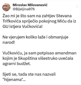 Podsjećamo da je u četvrtak Milovanović otvoreno zažalio što je spriječio bivšeg gradonačelnika Miću Mićića da iz Gradske uprave istjera Vučkovića, ujedno izražavajući nevjericu u njegovu količinu laži.