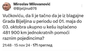 „Da li je tačno da je iz blagajne Grada Bijeljina od 1.maja do 03.oktobra ukupno u kešu isplaćeno 481.900 km jednokratnih pomoći.