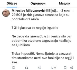 Bivši predsjednik GrO Bijeljina Miroslav Milovanović oglasio se na „Iks“ mreži sa jasnom porukom, da bivšim koalicionim partnerima u Bijeljini koji otvoreno dogovaraju saradnju u narednom periodu sa Ljubišom Petrovićem u gradskoj vlasti treba uzeti sve funkcije na regiji i šire.