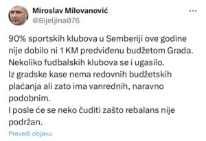 Da situacija prerasta u otvoreni problem, potvrđuje i oštra reakcija člana Predsjedništva SNSD i Miroslava Milovanovića, koji je na mreži X objavio da 90% sportskih klubova u Semberiji ove godine nije dobilo ni jednu jedinu marku predviđenu gradskim budžetom, dok su se “nekoliko fudbalskih klubova već ugasili”. Prema njegovim riječima, iz gradske kase nema redovnih budžetskih uplata, ali zato ima vanrednih, naravno, isključivo podobnima.