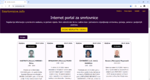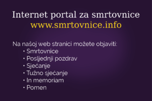 Portal smrtovnice.info svim čitaocima predstavlja novinu – digitalni oglasni prostor za objavljivanje smrtovnica. Na ovom portalu se možete informisati o preminulim licima sa teritorije grada Bijeljine, iz okoline i iz dijaspore. Sadržaj se ažurira svakodnevno, kako bi čitaoci imali pravovremene informacije u svakom trenutku.
