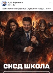 Gradski odbor SNSD-a Bijeljina najoštrije osuđuje sraman i nedopustiv napad u kojem je predsjednica Skupštine grada na zvaničnoj stranici SDS Bijeljina kroz montiranu sliku predstavljena kao nešto što jasno asocira na „đavola“.
