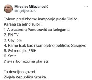 Objavu je zaključio porukom: „To dovoljno govori. Živjela Republika Srpska.“