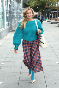 Sara Džesika Parker i te kako ume da iznese predimenzionirani tirkizni džemper koji je spojila sa čarapama iste boje, sa lepršavom kariranom suknjom i bež salonkama s elegantnom mašnom.