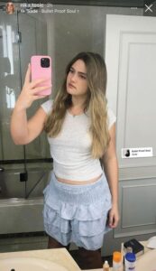 Odabrala je mini suknju u svetlo plavoj boji i sivu majicu. Sredila je frizuru i malo se našminkala. Inače, putem TikToka Nika često snima tutorijale gde sa devojčicama deli svoje dnevne rutine i omiljene proizvode za negu i šminku.