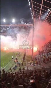 Navijači su pobesneli i krenuli da divljaju na stadionu, bacali su baklje i na teren i na tribinu gde su domaći navijači i sudija je u 65. minutu prekinuo utakmicu.