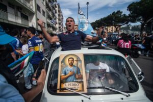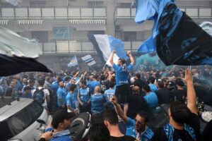 Navijači Napolija su od ranog jutra stacionirani po ulicama grada ispod Vezuva kako bi pogurali svoje igrače na putu do stadiona Maradona.