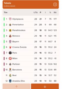 Sada imaju 16 pobeda i 13 poraza jer im je ovo treća uzastopno izgubljena utakmica u Evroligi, a sledi duel u Atini protiv Olimpijakosa…