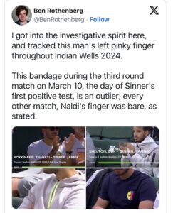 „Ove fotografije se poklapaju i potvrđuju vremensku liniju u Sinerovoj odbrani, da bude jasno, pošto je navedeno da je zavoj skinuo 5. marta. Ponovno zavijanje prikazano tokom meča trećeg kola 10. marta je vanredno“, konstatuje Rotenberg.