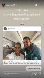 „Rafa, jedan post nije dovoljan da iskažem poštovanje koje gajim prema tebi i onome što si učinio za naš sport. Inspirisao si milione dece da počnu da igraju tenis i mislim da je to verovatno najveće dostignuće koje svako može da poželi. Tvoja upornost, posvećenost, borbenost će se učiti decenijama. Tvoje nasleđe će živeti zauvek. Samo ti znaš šta si morao da pretrpiš da bi postao ikona tenisa i sporta uopšte. Hvala ti što si me toliko puta gurao do same granice u našem rivalstvu koje je najviše uticalo na mene kao igrača. Tvoja strast za predstavljanjem Španije je uvek bila izuzetna. Želim ti najbolji mogući oproštaj u Malagi sa Dejvis kup timom Španije. Biću tamo lično da odam poštovanje tvojoj zvezdanoj karijeri„, napisao je Novak.
