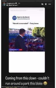 Nik Kirjos je na svom Instagramu podelio video snimak incidenta i napisao: „Dolazi od ovog klovna. Ovaj tip ne bi mogao ni da potrči kroz park.“