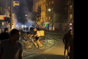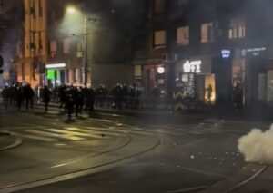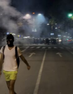 Kako se može videti na snimku objavljenom na društvenim mrežama, na raskrsnici ispred Pravnog fakulteta demonstranti su bacali zapaljene baklje i petarde, a čuju se i topovski udari.