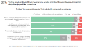 Oko 80 odsto građana Srbije podržava većinu zahtjeva studenata, a trećina populacije navodi da je učestvovala u aktuelnim protestima. Studentske proteste podržava 64 odsto građana, saopštila je Crta posle najnovijeg istraživanja.