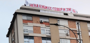 Na vrhu zgrade u centru Niša postavljen je transparent “Neka se ljubi sever i jug”. Doneli su ga studenti iz Novog Sada.