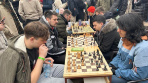 Nešto dalje građani i studenti se takmiče u dizanju tegova, a rezultate zapisuju na tabli na zidu zgrade. U Nišu se igra i šah.
