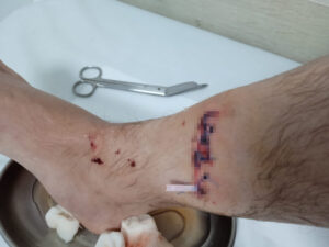 „Po lekarskom izveštaju nakon pregleda obavljenog u Kliničkom centru Vojvodine, krater je promera 3×1,5 centimetara i dubine do kosti. U otvorenoj rani su nađeni strani objekti, verovatno delovi topovskog udara ili spaljene čarape i pantalone. Nekako su uspeli da zašiju ranu i trenutno imam ožiljak veličine 10 centimetara“, kaže za Novu.