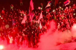 Zapaljene su i baklje. Atmosfera je dostigla usijanje, kako se može videti na snimku ulaska „kraljevačkog bataljona“ u centar Kragujevca.