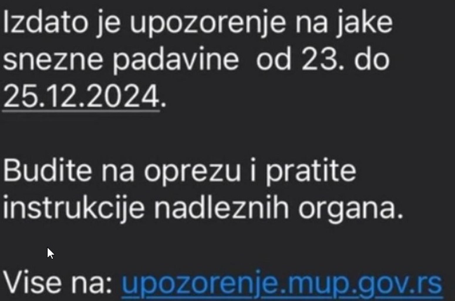 „Izdato je upozorenje na jake snežne padavine od 23. do 25. decembra. Budite na oprezu i pratite instrukcije nadležnih organa. Više na sajtu Upozorenja MUP.