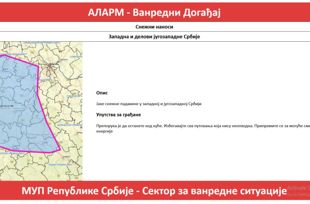 RHMZ je u 12 sati izdao hitno upozorenje za sve građane Srbije, a povodom nadolazećih snežnih padavina. Takođe je, i to prvi put, aktiviran „sistem za prenos SMS hitnih informacija građanima“.