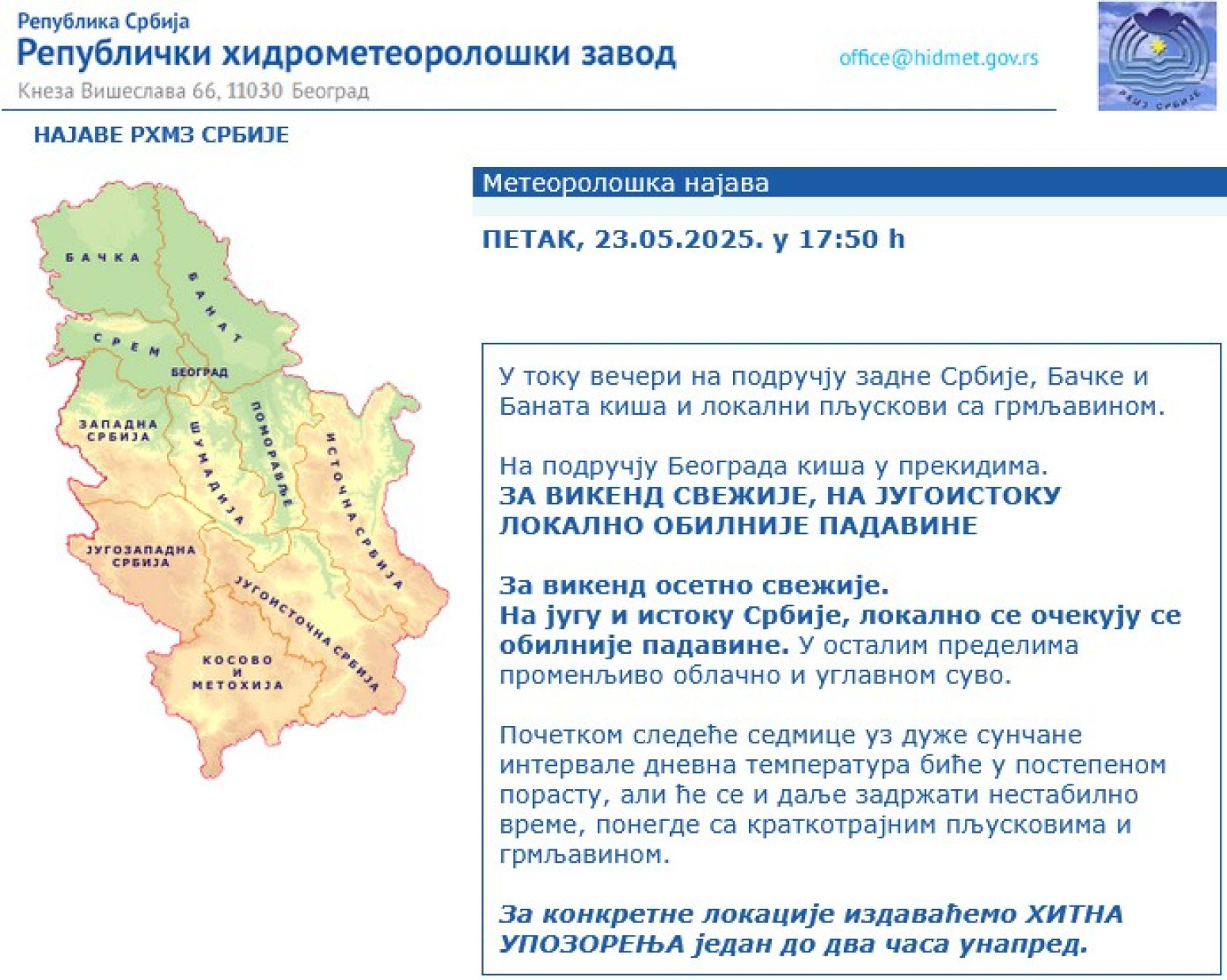 Republički hidrometeorološki zavod Srbije (RHMZ) se ponovo oglasio i najavio da se u toku večeri na području zapadne Srbije, Bačke i Banata očekuju kiša i lokalni pljuskovi sa grmljavinom.