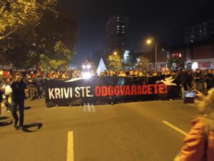 Ispred Železničke stanice upravo je počeo protest građana. Građani su razvukli transparent „Krivi ste. Odgovaraćete“, a pored ovog transparenta građani nose slike stradalih u nesreći.