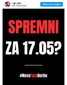 Osim toga, samoorganizovana neformalna grupa niških studenata u blokadi, najavila je izlazak na ulicu 17. maja uz misterioznu objavu na Insagramu u kojoj kratko piše: