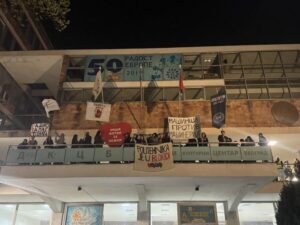 Studenti su na terasi javnog servisa razvili transparente „Mašinci protiv mašinerije“, „Politehnika je u blokadi“, „Radio talas studenata“.