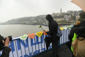 Učesnici protesta „Na tri mosta, sad je dosta“ simboličnim bacanjem 19 belih ruža za žrtve masakra u Osnovnoj školi „Vladislav Ribnikar“ i selima Dubona i Malo Orašje, okončanli su danas devetnaestominutnu tišinu i odavanje počasti ubijenima, javljaju reporterke FoNeta.