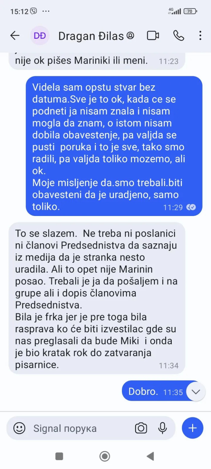 „Ne treba ni poslanici ni članovi Predsedništva da saznaju iz medija da je stranka nešto uradila. Trebalo je da ja pošaljem obaveštenje na grupe i dopis članovima Predsedništva. Bila je frka jer je pre toga bila rasprava ko će biti izvestilac, gde su nas preglasali da to bude Miki Aleksić, i onda je bio kratak rok do zatvaranja pisarnice“, odgovorio mi je Đilas.