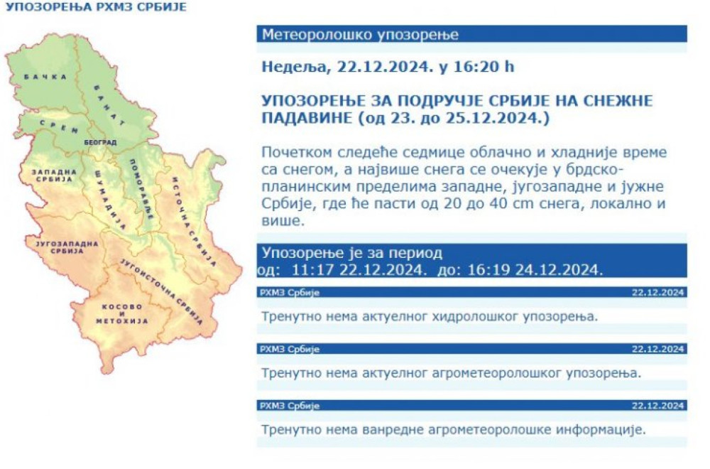 Republički hidrometeorološki zavod Srbije (RHMZ) izdao je na svom sajtu upozorenje na velike snežne padavine.