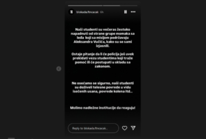 Kako su naveli na Instagramu, studenti su napadnuti s leđa u subotu uveče od strane grupe momaka.