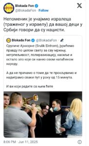 Studenti FON-a su na svom X nalogu objavili da je upravo Ajnhorn, koji je već pod istragom u Izraelu, razlog zašto naprednjaci govore “vašoj deci da su nacisti”.