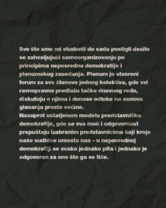 Naveli su i da su „sve što su do sada postigli – zahvaljujući principima neposredne demokratije i plenumskog zasedanja“. „Plenum je otvoreni forum za sve članove jednog kolektiva, gde svi ravnopravno predlažu tačke dnmevnog reda, diskutuju o njima i donose odluke na osnovu glasanja proste većine“, objasnili su studenti.