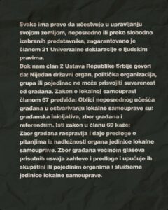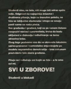 „Sve građanke i građani, koji su po Ustavu neopozivi nosioci suvereniteta, treba da budu uključeni u diskusiju i odlučivanje na temu aktuelne krize. Zbog toga vas pozivamo da se okrenete lokalnim samoupravama i samostalno organizujete po modelu neposredne demokratije – kroz zakonom predviđeno telo zbora građana. Pitaju se i odlučuju onih kojih se tiče – a to smo svi mi. Svi u zborove“, poručili su studenti u blokadi.