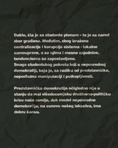 „Šta je za studente plenum – to je za narod zbor građana. Međutim zbog izražene centralizacije i korupcije sistema – lokalne samouprave, a sa njima i mesne zajednice, tendenciozno su zapostavljene. Snaga studentskog pokreta leži u neposrednoj demokratiji, koja je za razliku od predstavničke, nepodložna manipulaciji i potkupljivosti“, naveli su studenti u objavi na Instagramu, prenosi N1.