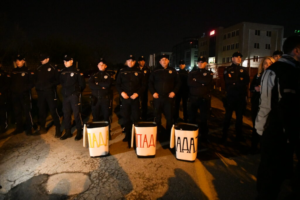 Studenti-redari su ostavili kante na kojima piše “Upadaj” ispred kordona policije koji od početka protesta ne dozvoljava prilaz zgradi.