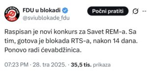 „Raspisan je novi konkurs za Savet REM-a. Sa tim, gotova je blokada RTS-a, nakon 14 dana. Ponovo radi ćevabdžinica“, naveli su studenti FDU u blokadi.