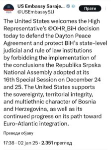 U saopštenju objavljenom na zvaničnom „X“ nalogu Ambasada je poručila kako Sjedinjene Američke Države podržavaju suverenitet, teritorijalni integritet i multietnički karakter Bosne i Hercegovine, kao i njen kontinuirani napredak na putu ka evroatlantske integracije.