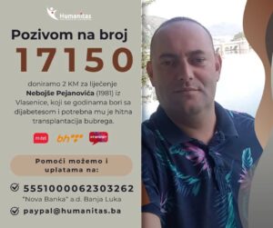 Sredstva za transplantaciju bubrega za Nebojšu Pejanovića iz Vlasenice moguće je uplatiti i direktno na žiro-račun broj: 5551000062303262 kod „Nova Banka“ a.d. Banja Luka ili na paypal@humanitas.ba. /kraj/