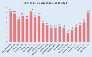 Na slici je prikazana srednja dnevna temperatura za najtopliji 31. decembar u posljednjih deset godina (2014-2023.) kao i godina pojave: